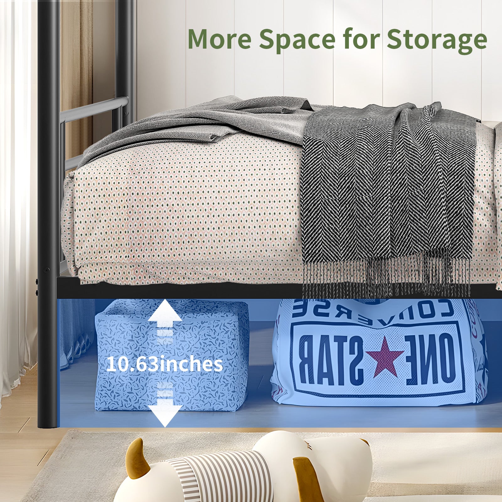 - Ample Underbed: Provides 10.63 inches of height underneath, offering convenient storage space for bedding, shoes, or personal items to keep the room tidy.