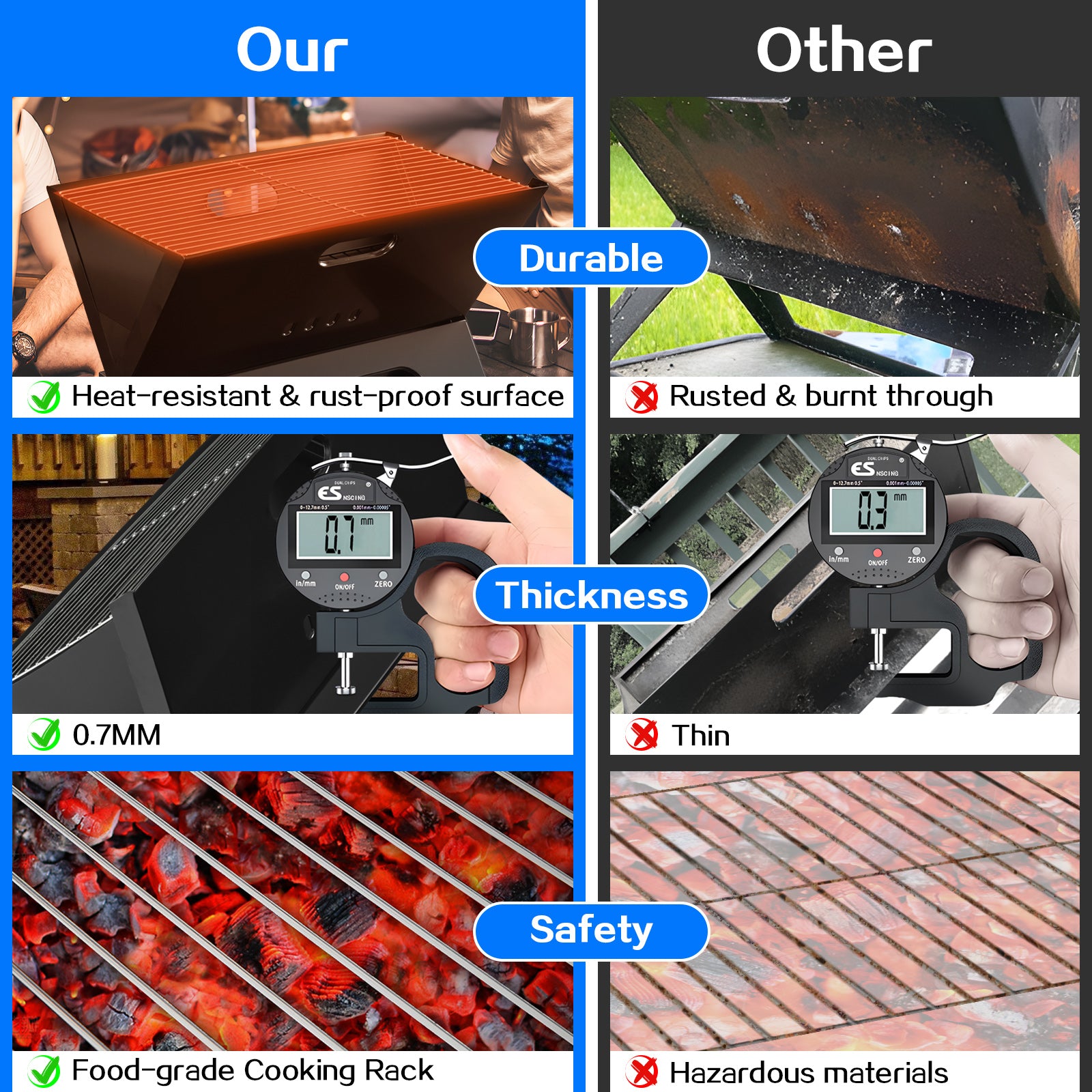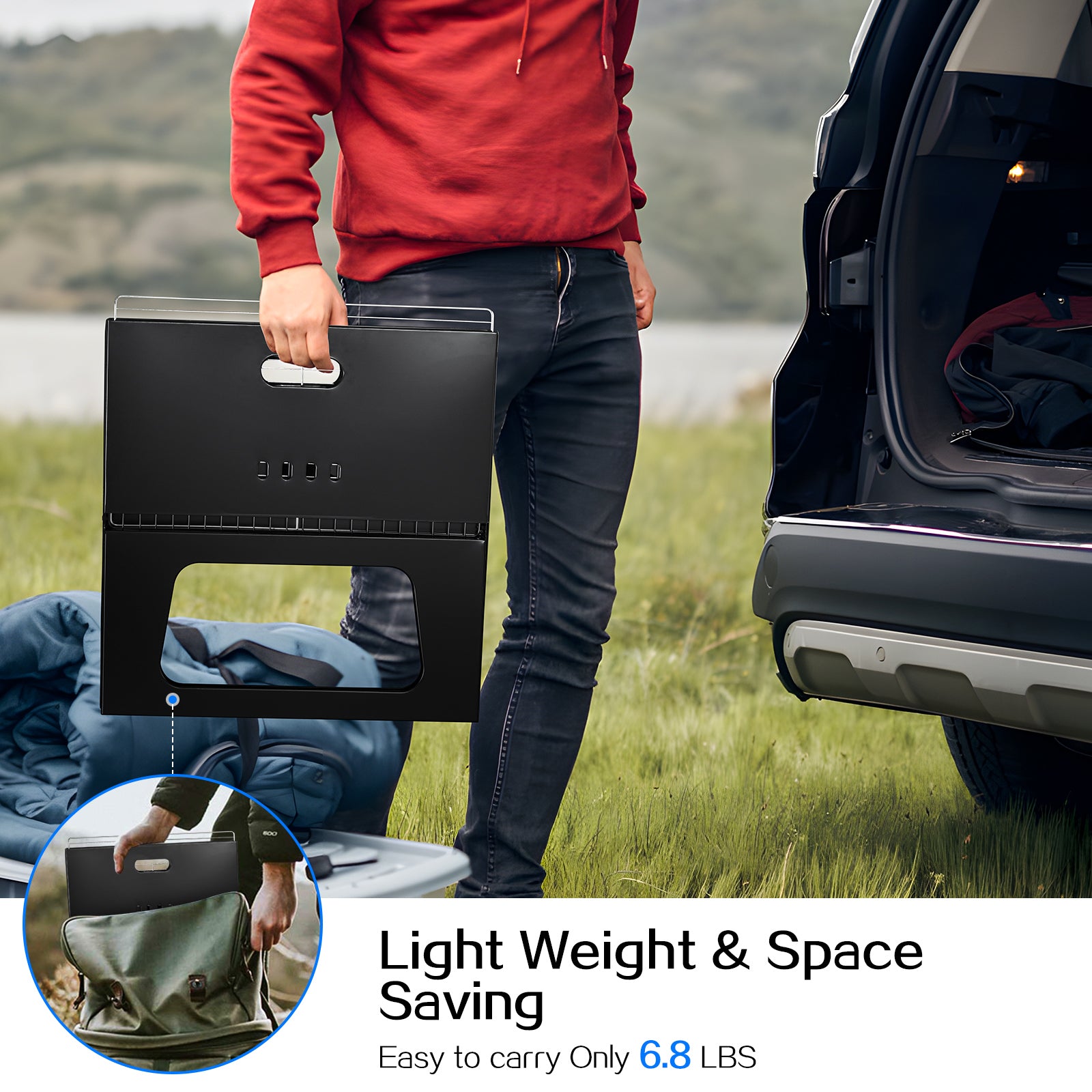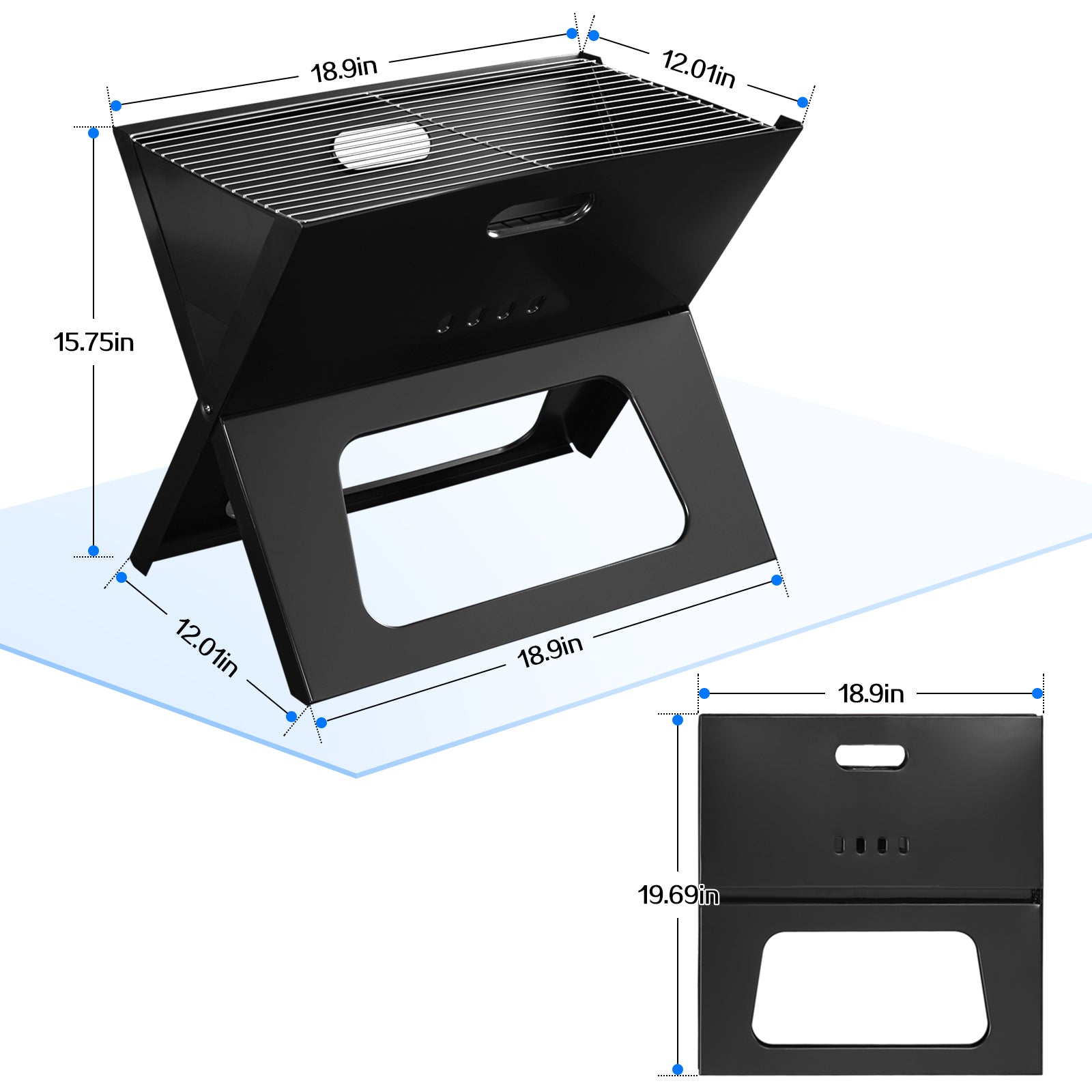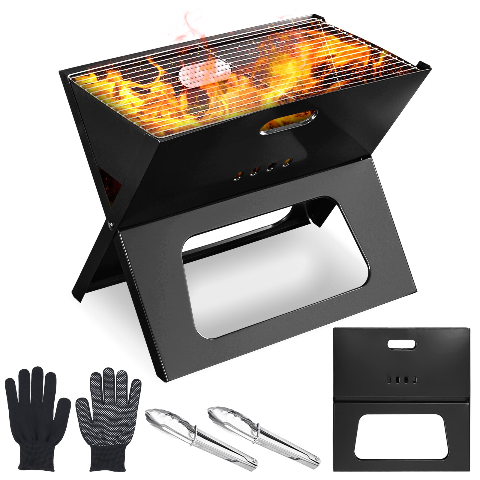 【Portable & Lightweight】: Our collapsible compact charcoal camping grill is perfect for any adventure. It folds flat for storage, easily fits in a backpack, car trunk, or beach bag, and is ideal for bonfires, picnics, and BBQs.