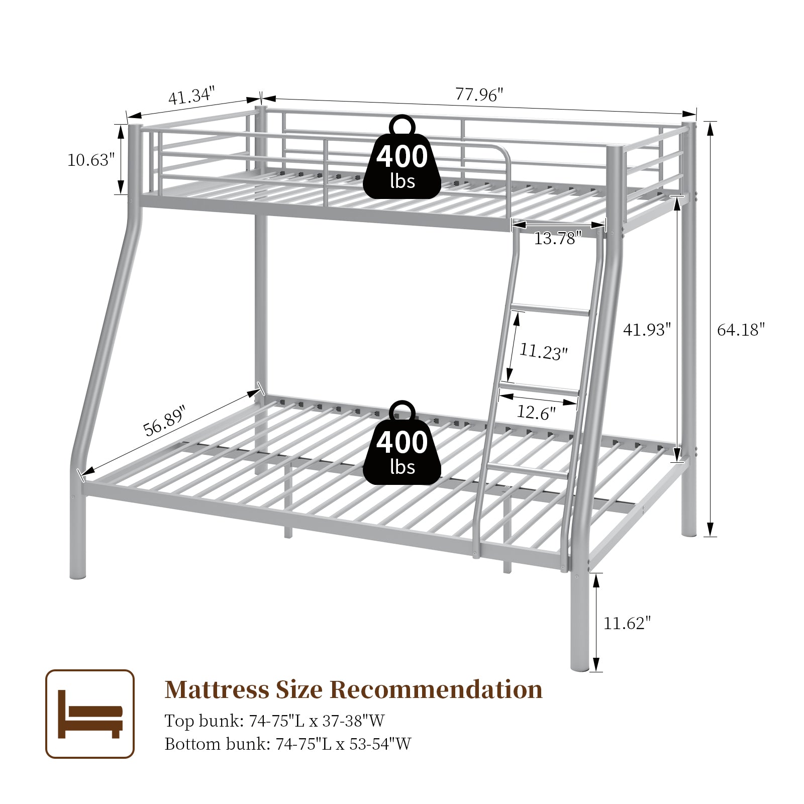 Capri Twin over Full Size Metal Bunk Bed for Teens Adult with 12" Under-Bed Storage & Ladder & Full-Length Guardrail, Space-Saving, Heavy-duty, Silver